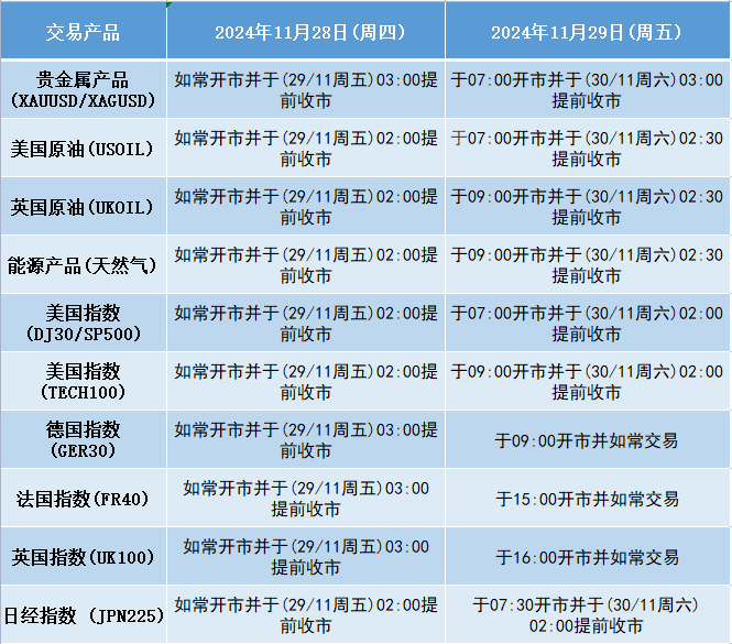 美国感恩节假期交易时间调整通知